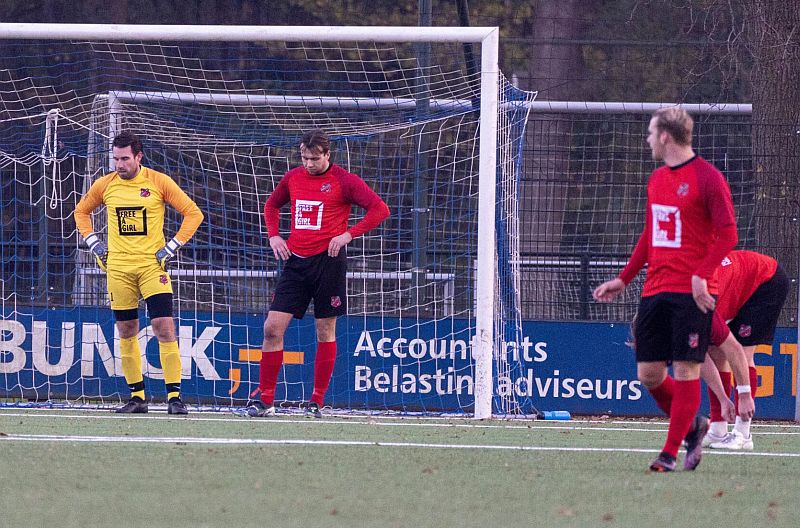 De teleurstelling druipt er af bij spelers RKDES na 2-1. Foto: Ronald Pothoff