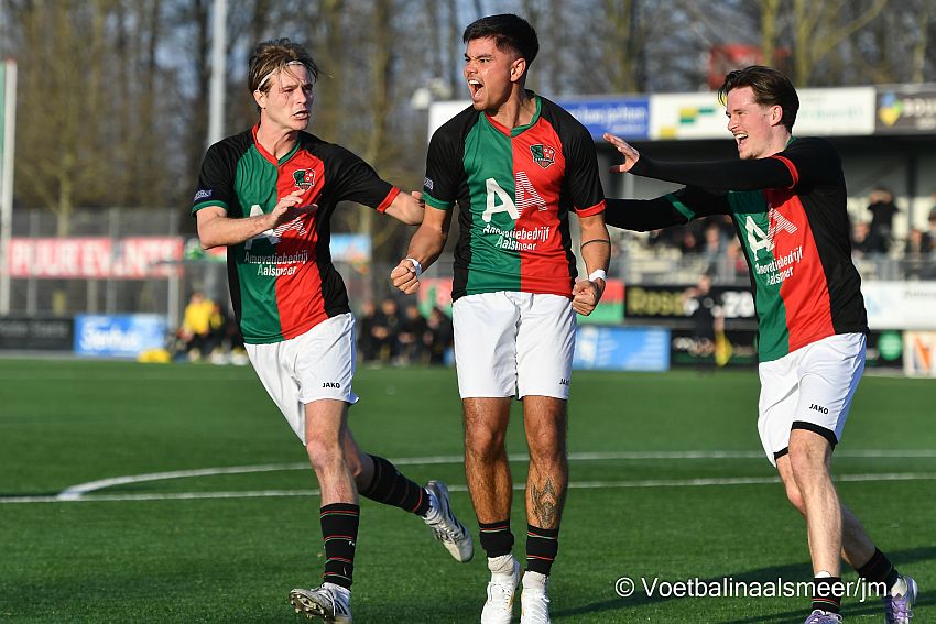 FC Aalsmeer heeft zaterdagmiddag een moeizame maar belangrijke 3-1 overwinning geboekt op DVVA. Na twee competitienederlagen op rij betekent de zevende winst voor de vierdedivisionist een iets vastere positie in de middenmoot. De zege voor de roodgroenen ging zeker niet van een leien dakje. De formatie van Erwin Tump speelde een opmerkelijk slecht eerste half uur waarin de thuisclub vooral defensief veel steken liet vallen. Klap voor de gastheer was de vroege tegentreffer in de 6e minuut, een lage shuiver in de verre hoek van DVVA-aanvaller Giandro Kapel. De bal leek niet onhoudbaar voor goalie Björn Haggerty. FC Aalsmeer, dat het vanmiddag moest doen zonder de zieke middenvelders Giliano Eijken en Dylan Nieuwendijk, ontworstelde zich in het laatste kwartier van de eerste helft wat uit de vormciris. Eindelijk konden de Amsterdammmers, die vorig week verrassend subtopper Purmersteijn versloegen, een beetje onder druk worden gezet. Dat leidde vijf minuten voor rust tot de gelijkmaker. Na een korte hoekschop werd de bal vanaf de linkerkant voorgegeven, de mee opgekomen verdediger Oliver Rifai fabriceerde via een mooi uitgevoerde omhaal de 1-1. In de minuten voorafgaand en tot het pauzesignaal kreeg FC Aalsmeer eveneens mogelijkheden op een doelpunt, Ilias Ahamout, Bryan Iliohan en Luke Vahle waren er dichtbij.
