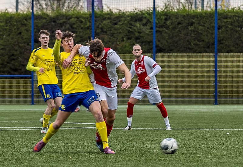 RCL-middenvelder Jarne Jetze Kanbier zet zich met de onderarm stevig af op LMV-er Camiel Schouten. Foto: Guido Damsteeg