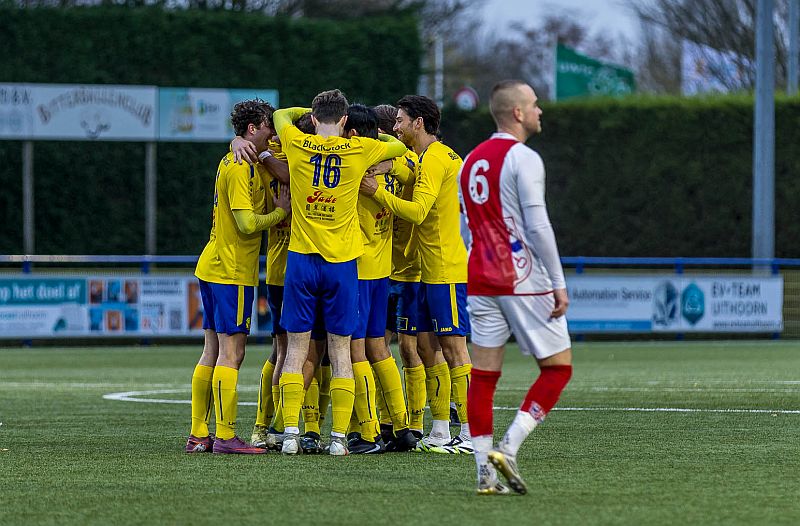 Legmeervogels heeft 3-0 gescoord. Aanvoerder Robin Brasker (6) van RCL ziet het Uithoornse feestje gelaten aan. Foto: Guido Damsteeg