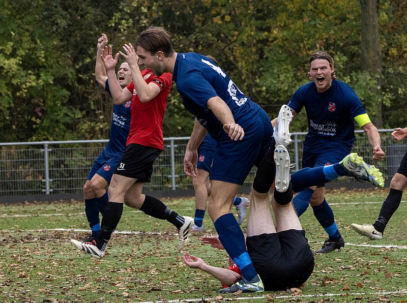 Luuk Westerman kopt de niet zichtbare bal in de touwen. Kort na rust 1-1. Aanvoerder Roy Enhoven juicht al. Foto: Ronald Pothoff