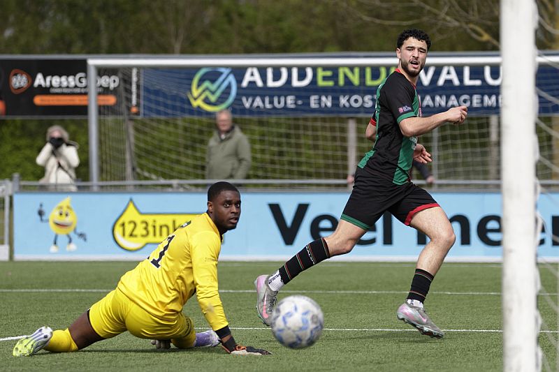 Ilias Ahamout kijkt hoe zijn schuiver doel zal gaan treffen. Doelman Shaquille Eendragt ziet het ook. Foto: Ton van Eenennaam