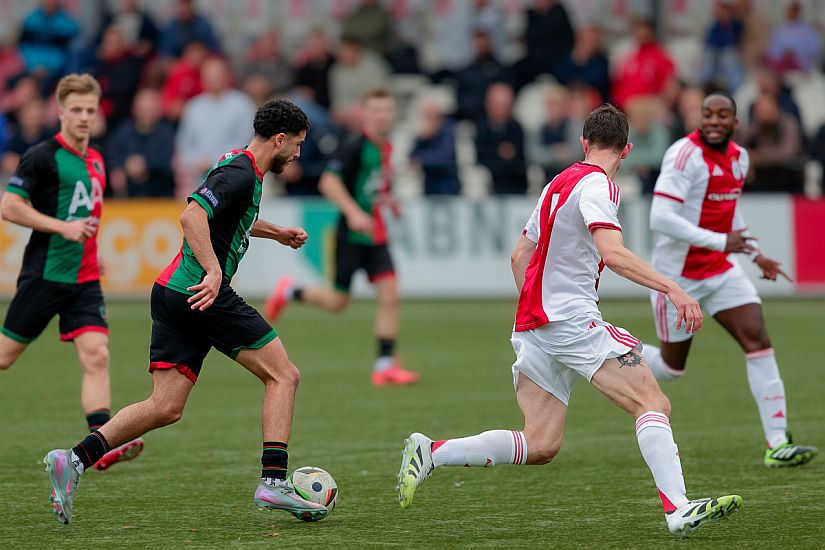 Michael Mol zet zijn tegenstander van Ajax opzij. Foto: Ton van Eenennaam