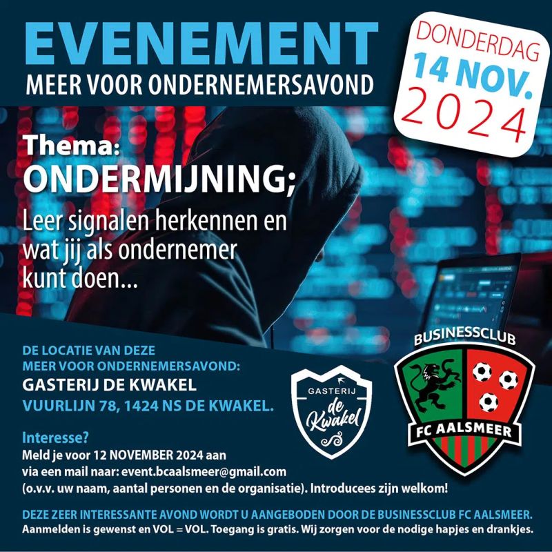 Na de spraakmakende en sportieve seizoenstart van de Meer voor Ondernemersavonden bij het Uithoornse Amstelhof, is de eerstvolgende editie een kleine kilometer dichterbij Aalsmeer. Gasterij De Kwakel is op 14 november gastheer voor een avond met als thema ‘Ondermijning’. Criminelen die legale bedrijven en diensten gebruiken voor illegale activiteiten, ondermijnen de samenleving. Dit doen zij door bijvoorbeeld panden te huren voor een drugslab. Daarbij schuwen criminelen niet om legale partijen te beïnvloeden of te onderdrukken en passen daarbij soms ook (zwaar) geweld toe. Denk aan liquidaties en explosies in woonwijken. Het effect is dat bovenwereld en onderwereld met elkaar verweven raken. Dit ondermijnt en bedreigt de samenleving en rechtsstaat. Om hier meer uitleg over te geven heeft Businessclub FC Aalsmeer een aantal interessante sprekers uitgenodigd. Maar uiteraard is de avond ook zoals altijd weer geschikt om te netwerken. Locatie: Gasterij De Kwakel, Vuurlijn 78 in De Kwakel. Aanvang 20 uur, binnenlopen vanaf 19:30. Graag aanmelden voor 12 november via: event.bcaalsmeer@gmail.com. Introducees zijn van harte welkom.
