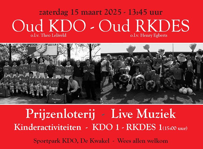 De 'hoofdact' aanstaande zaterdag aan de Vuurlijn in de Kwakel is uiteraard de burenstrijd in 3B tussen KDO en RKDES. De op papier interessante derby start om 15.00 uur. De thuisclub maakt van de middag echter een behoorlijke happening, de tweestrijd wordt omlijst door tal van activiteiten. Zo organiseert KDO zaterdag de jaarlijkse sponsordag in combinatie met een familiedag, is er een loterij voor het goede doel, en zijn er veel activiteiten voor kinderen. En na afloop is in het clubhuis de uitslag van de loterij en livemuziek.