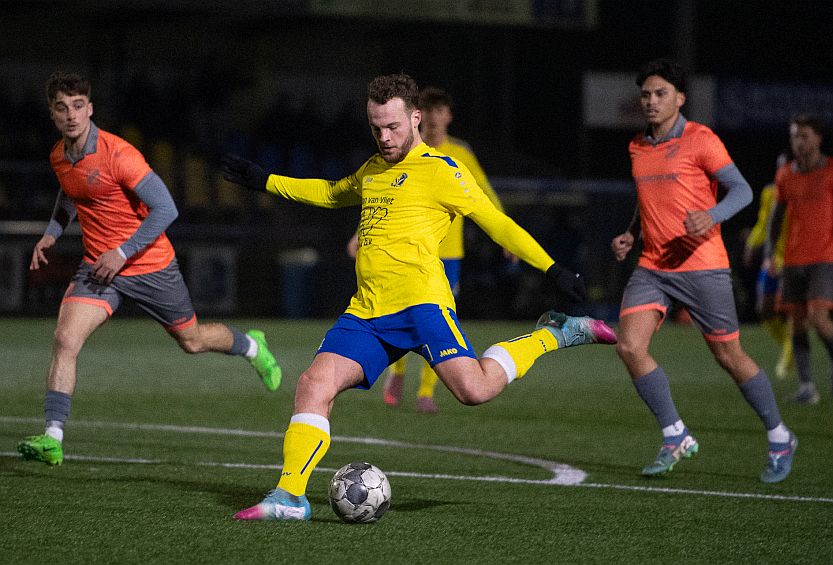 Duidelijk overwicht Het sterke positiespel van de thuisclub, elke keer werd de vrije man gevonden, leidde voor rust tot een aantal prima doelkansen. Met aanvallers Dion Reuvekamp, Camiel Schouten en Chris Zaïde in een uitstekende rol. Na een klein kwartier was het raak. Diep op het middenveld kreeg Schouten de bal in de voeten aangespeeld, bediende snel Reuvekamp aan de buitenkant die zich nauwelijks bedacht en met een hard schot doelman Sem Grapendaal het nakijken gaf.