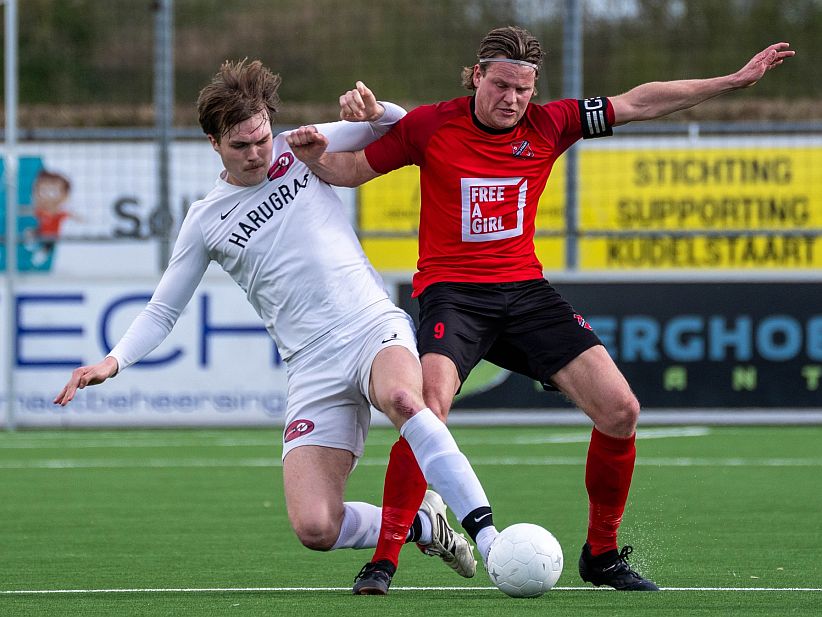 Ruben Onderwater (links) heeft de beslissende 2-1 gemaakt uit een vrije trap. Lorenzo Zorn is ook blij. Foto: Ronald Pothoff